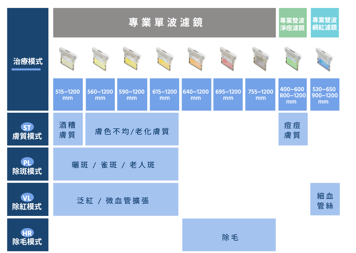 適用於改善臉部斑點(曬斑/雀斑)、血管擴張泛紅、酒糟肌膚、青春痘發炎困擾,以及期望改善肌膚粗糙、細紋等光老化現象之對象。